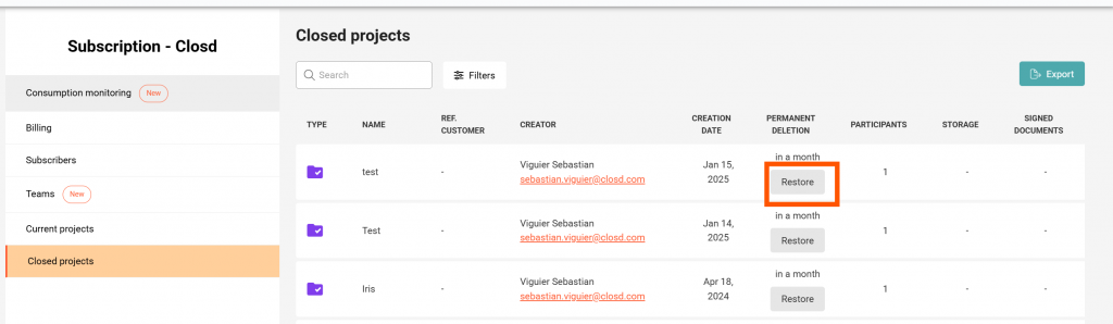 Closing a Project results in all Project Participants instantly losing access to the Project. However, Administrators can reactivate a Project in the Subscription area. To access the Subscription area: