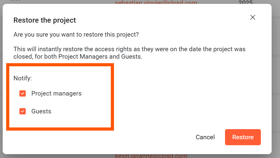 On the line listing the concerned Project, there is an icon indicating how long you have left before the Project is permanently deleted. Click on the button restore the Project. All the Project’s data and access rights will subsequently be restored identically as they were before.