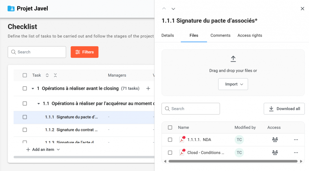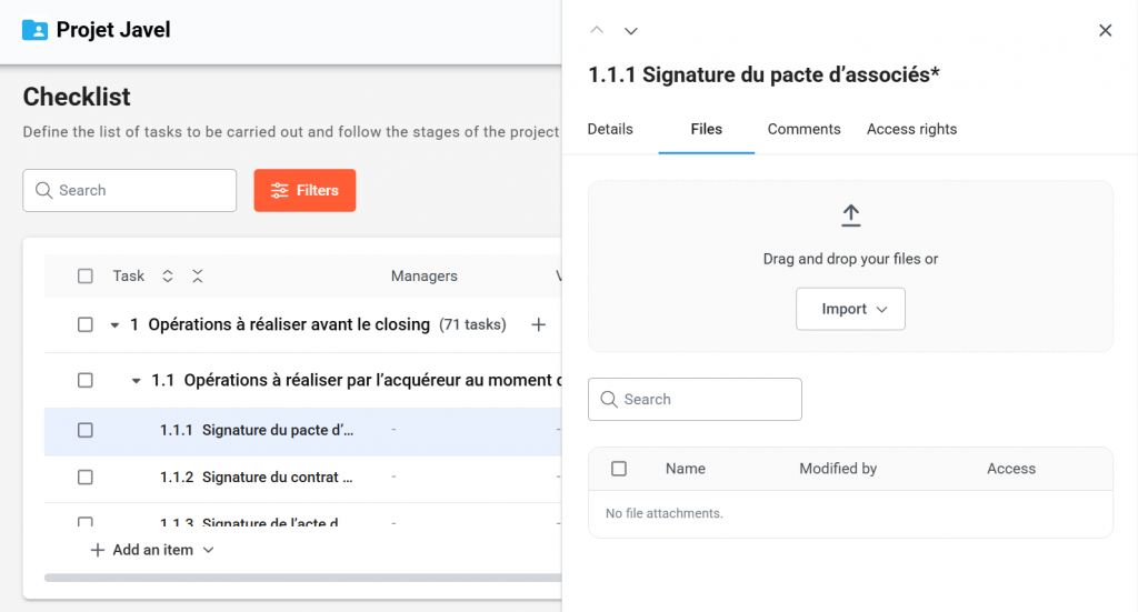When you click on the button in the email you receive informing you that you have been designated as responsible for a task, you will be redirected to the Checklist and can easily attach one or more files to the task from there.