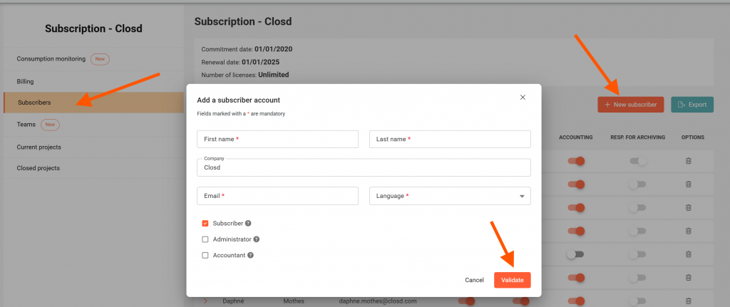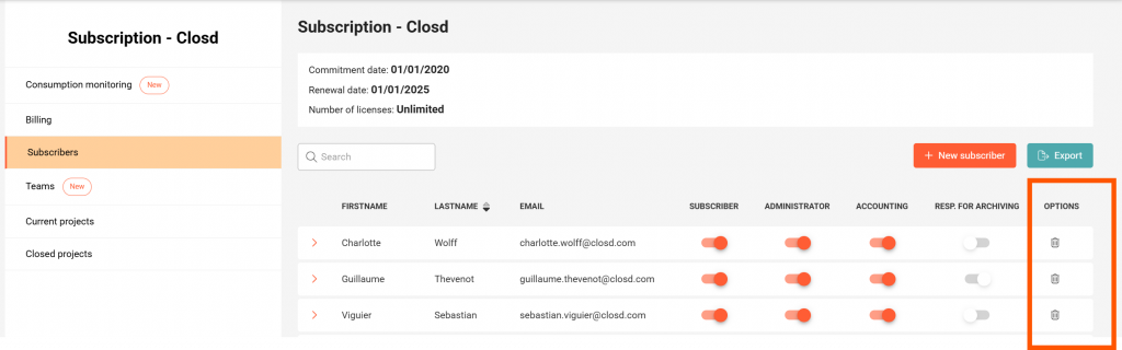 – To delete a Subscriber, click on the icon 🗑️ to the right of the row of the Subscriber concerned. Their access to the Projects linked to the subscription will then be withdrawn, but their account will not be permanently deleted. The permanent deletion of the account and personal information can be requested by writing to privacy@closd.com