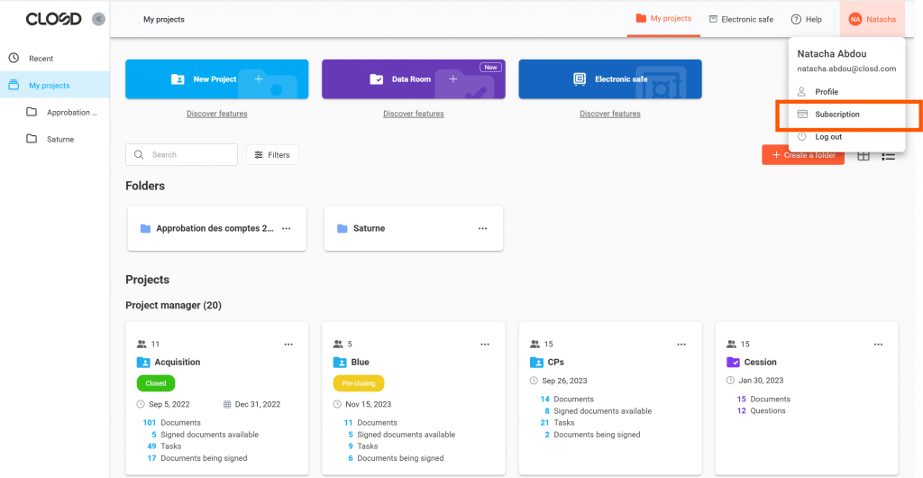 To access the subscription management area, an Administrator must click on their name at the top right of the interface, then on the Subscription button.