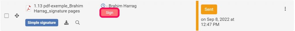 If you are a Signatory of a document, a Sign button appears to the right of your name, on the relevant document’s line, when it’s your turn to sign it.