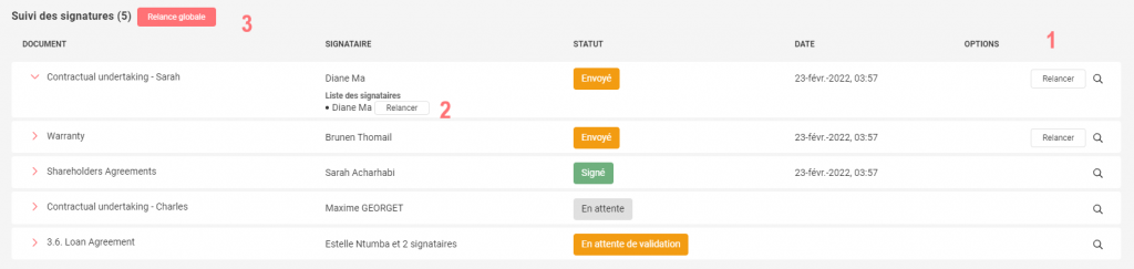 Signatories who have not signed are automatically reminded on D+1 and D+4 from the start of the Signing Session. Project Managers can also send manual reminders from the Settings page, by going to the signature tracking section at the bottom of the page.