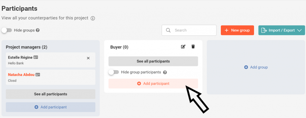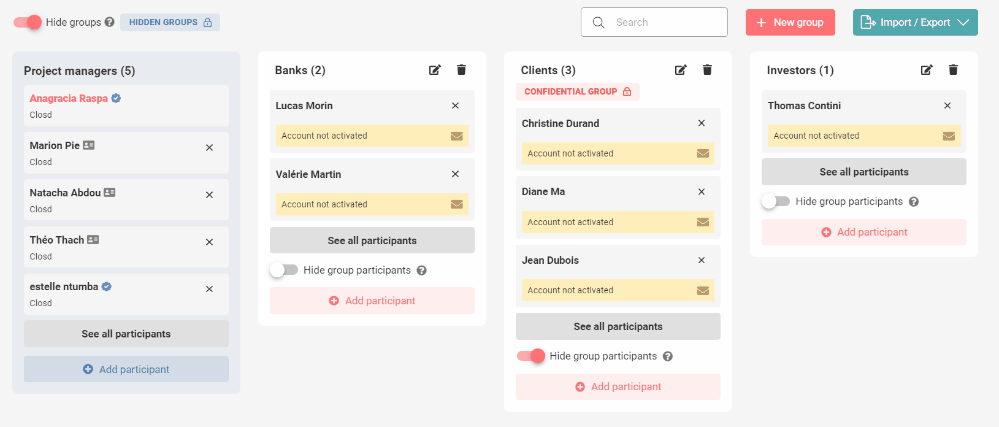 Groups allow Participants to be brought together according to common characteristics or interests (lawyers, clients, financial advisers, members of the same company, etc.). Project Managers can then share documents or assign tasks on the Checklist to an entire group. This simplifies the configuration of access rights.