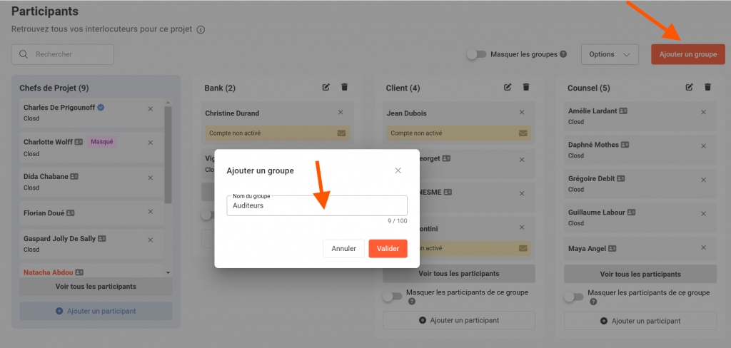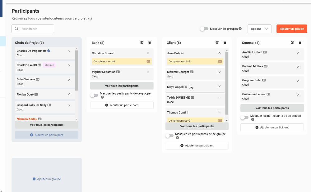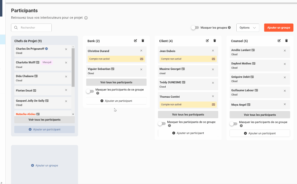 Les Groupes permettent de rassembler les Participants selon des caractéristiques ou intérêts commun(e)s (avocats, clients, conseils financiers, membres d’une même entreprise, etc.). Les Chefs de projet peuvent alors partager des documents ou assigner une tâche de la Checklist à l’ensemble d’un groupe. Cela simplifie la configuration des droits d’accès.