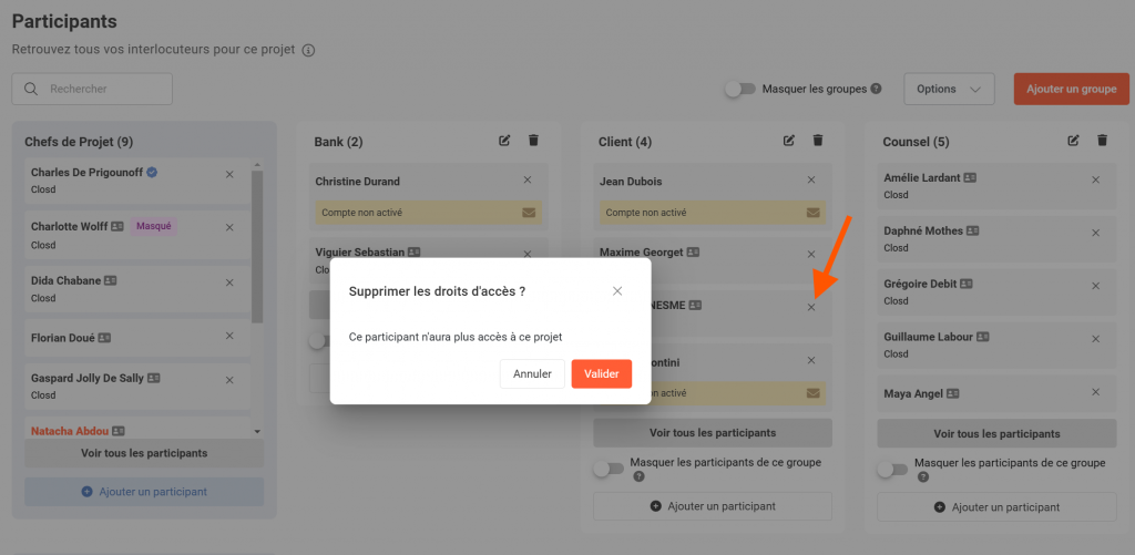 Cliquez sur la croix à droite du nom d’un Participant pour le retirer du Projet.