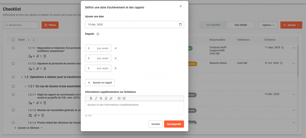 - Leur envoyer des rappels automatiques en définissant la fréquence via la colonne « date d’achèvement ». En cliquant sur l’échéance de la tâche, la fenêtre ci-dessous s’affiche :