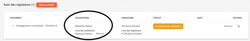 Dans la colonne validateurs, cliquez sur le bouton « relancer » pour envoyer un email de relance.