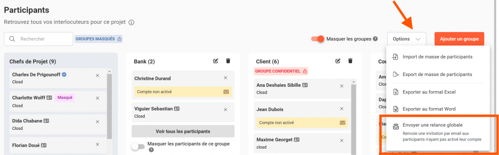 Pour relancer tous les participants qui n’ont pas activé leur compte, cliquez sur Options puis envoyer une relance globale.