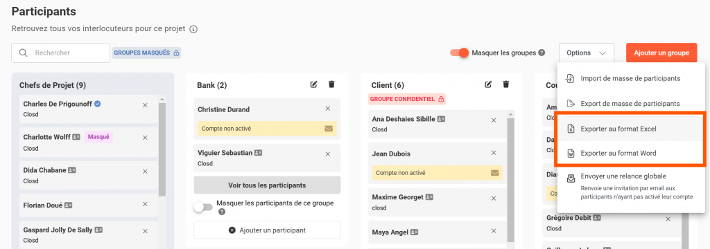 Les Chefs de projet peuvent télécharger la liste des Participants, en format Word ou Excel en cliquant sur le bouton Options puis Exporter au format Excel ou Exporter au format Word.