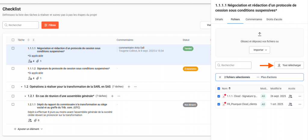 Etape 2 : Utilisez la multi-sélection pour télécharger plusieurs ou tous les fichiers joints à la checklist en une seule fois