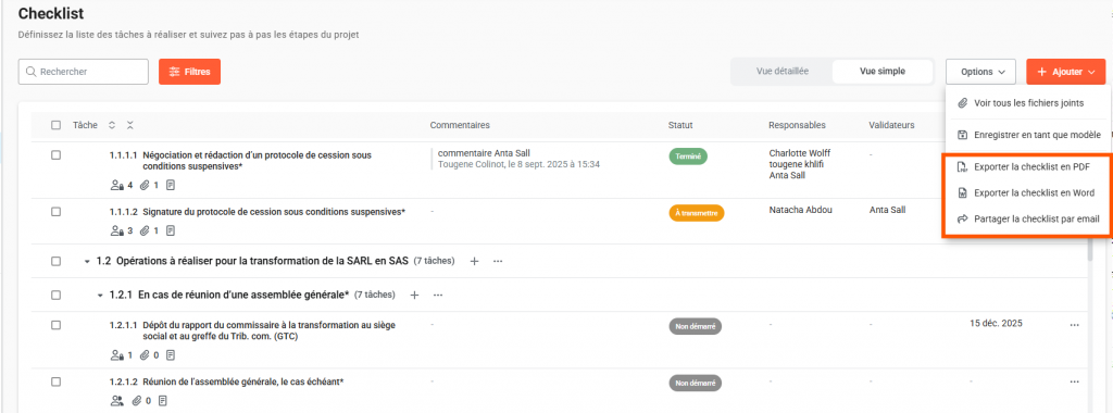 Vous pouvez exporter votre checklist au format Word ou PDF en cliquant sur Options en haut à droite de la page Checklist puis en sélectionnant « Exporter en PDF » ou « Exporter au Word ».