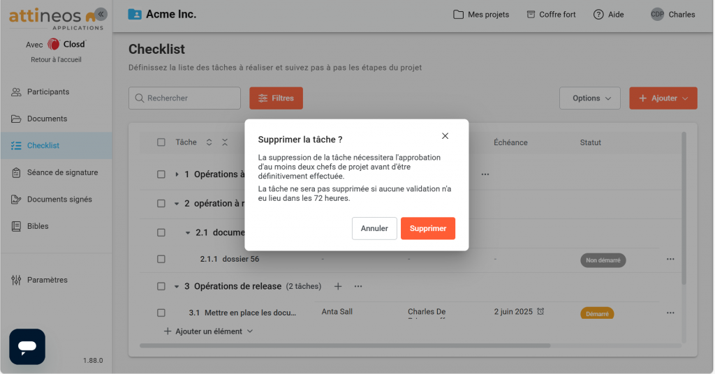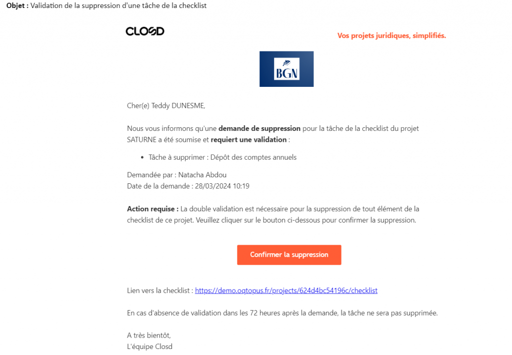 En cas de validation de deux chefs de projet dans un délai de 72 heures, la tâche est supprimée. Dans le cas contraire, la tâche ne sera pas supprimée et pourra être à nouveau modifiée.