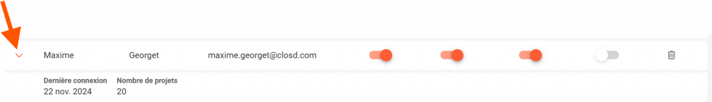 Sur la page Abonnés, dépliez la ligne correspondant à l’abonné pour y faire apparaitre son nombre de projets actifs et sa date de dernière connexion.