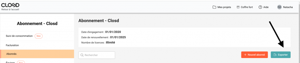 L’espace Abonnement vous offre la possibilité de télécharger plusieurs exports au format Excel qui vous donne une vision d’ensemble sur les abonnés ou encore les projets en cours.