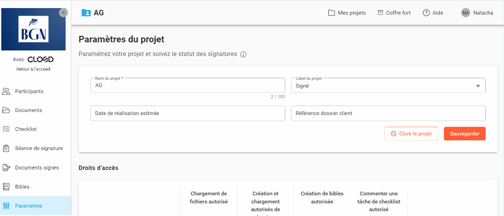 La fermeture d’un Projet entraîne la désactivation instantanée des accès de tous les Participants au Projet (y compris le vôtre).