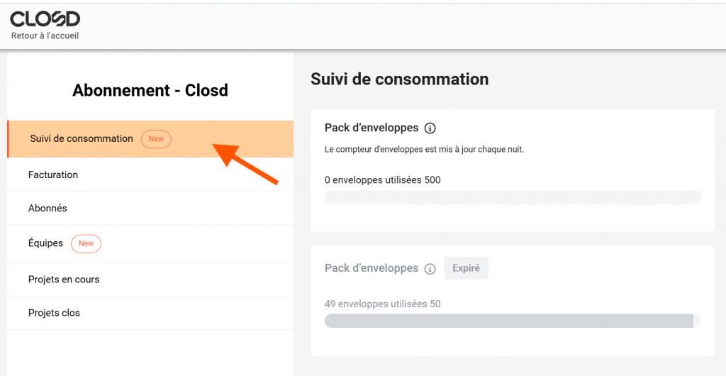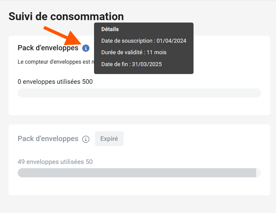 Les administrateurs de leur abonnement peuvent accéder à la zone abonnement et suivre l’évolution de la consommation de leur pack de signatures.