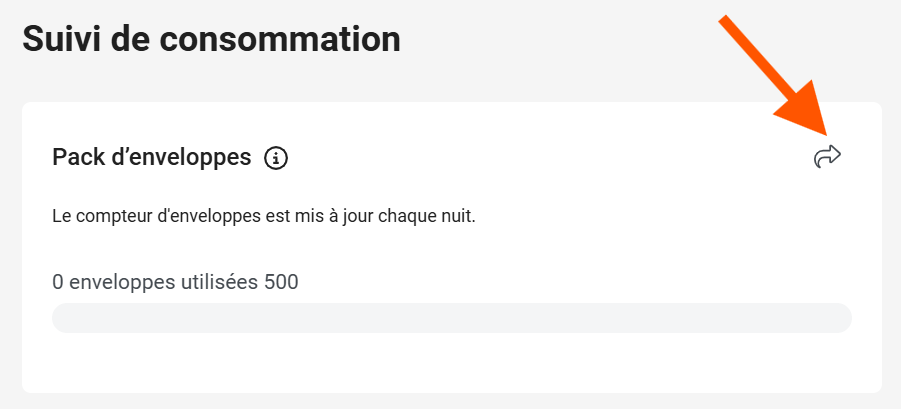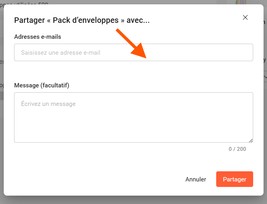 Vous pouvez renseigner un ou plusieurs destinataires avant de cliquer sur le bouton partager. Ils recevront chacun un e-mail avec le nombre d’enveloppes utilisées, la date de dernière mise à jour du pack, la date d’expiration du pack et le message personnalisé si vous l’avez renseigné.